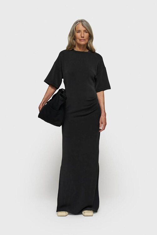 Omschrijving: De Soft Scuba Tee Dress van 10DAYS in zwart biedt een perfecte balans tussen comfort en elegantie. Met een plooidetail aan de linkerzijde, zijsplitten en een '10' folieprint op de rug is het een stijlvolle en comfortabele keuze voor elke gelegenheid.