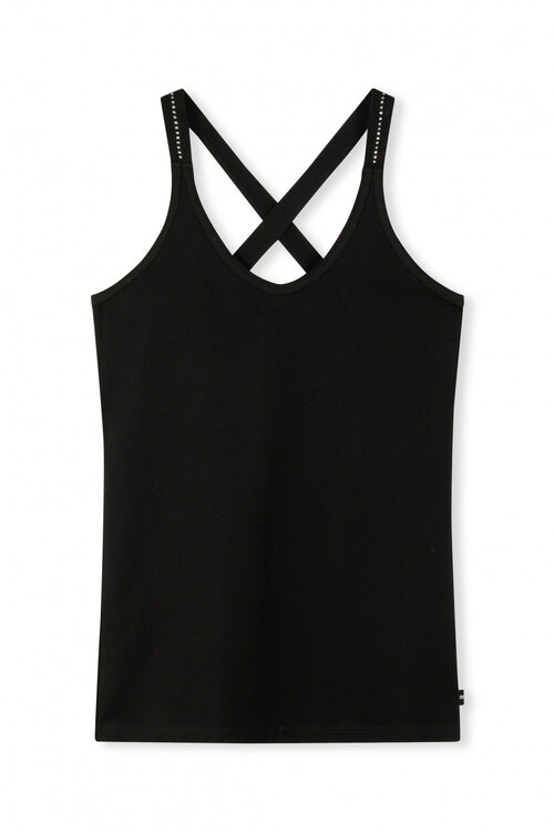 Slim fit model in zwart met gekruiste strass bandjes op de rug. <br />Vervaardigd uit biologisch katoen, met een vintage afwerking bij de hals en een subtiel mini stripes logo op de rug. <br />Perfect om onder elke outfit te dragen dankzij de comfortabele Lees meer.