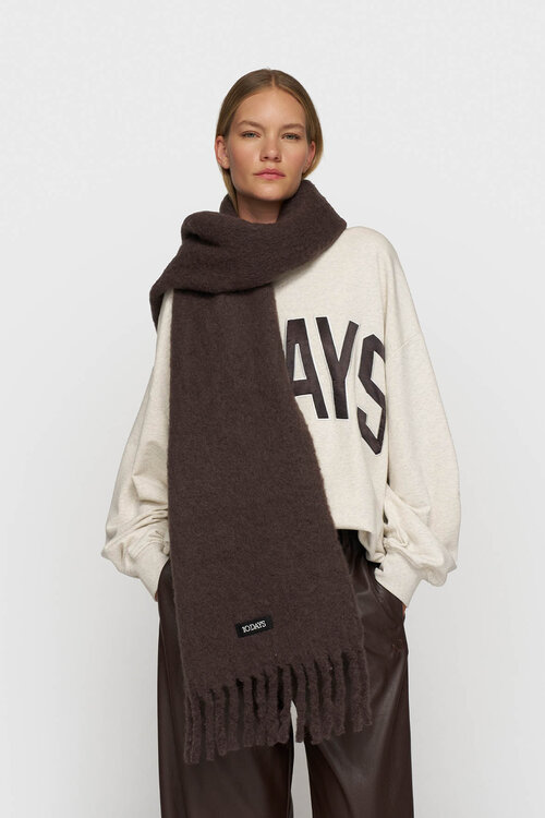 Heerlijk zachte, dik geborstelde sjaal met franjes in een rijke diepe wijnkleur. Lichtgewicht, warm en stijlvol afgewerkt met een 10DAYS label.