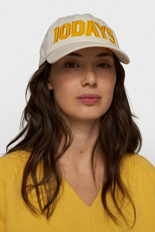 De ecru 10DAYS pet is een trendy en sportief accessoire dat je outfit een relaxte uitstraling geeft. Deze katoenen cap heeft een 10DAYS logo aan de voorkant en een subtiele mini-stripes borduring aan de achterkant voor een uniek detail.