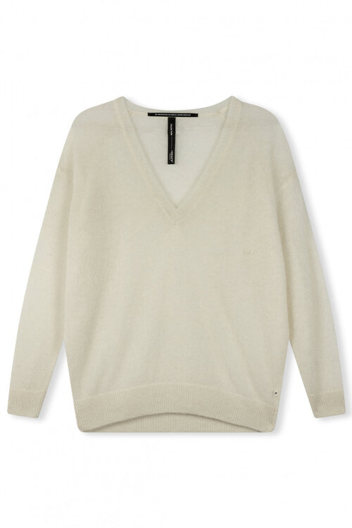 Comfortabele trui met een V-hals en ribgebreide afwerkingen.<br />Deze trui is vervaardigd uit zachte alpaca en heeft een subtiele mini stripes logo borduursel op de achterkant. <br />Combineer met een hoge strass versierde wrapper onder de trui voor extr Lees meer.