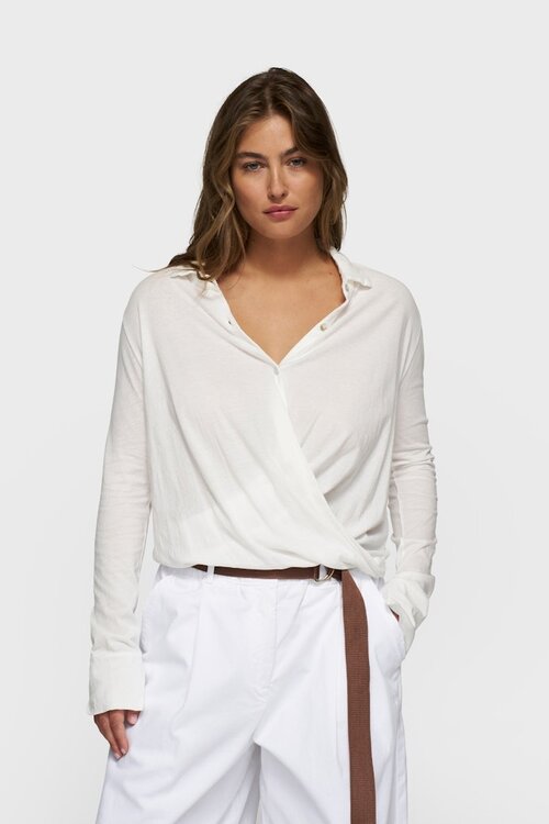 Deze regular fit overslagblouse is gemaakt van licht gestructureerde jersey en heeft een rechte zoom met splitten aan de zijkanten. De blouse is voorzien van een kraag met knoopsluiting, manchetten met split en een geborduurd monogram op de linkermouw. Uitgevoerd in de kleur truffle, biedt deze 10DAYS Amsterdam blouse een comfortabele regular fit. Het materiaal bestaat uit 100% biologisch katoen.