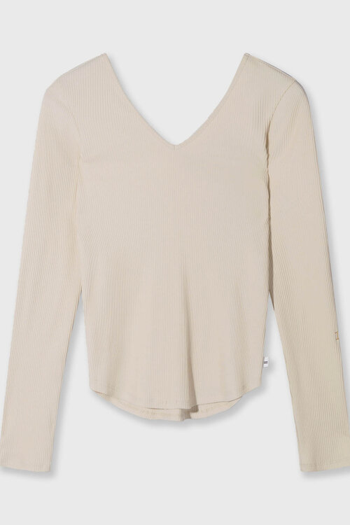 Deze longsleeve top heeft een slanke pasvorm en is vervaardigd van zachte, GOTS-gecertificeerde biologische katoenen rib jersey. De top heeft een diepe V-hals, een afgeronde zoom, een monogram borduursel op de linkermouw en een mini stripes label bij de zoom. De v-neck long sleeve ballet top van 10DAYS Amsterdam komt in de kleur light earth en biedt een slim fit. Het materiaal bestaat uit 95% biologisch katoen en 5% elastaan.