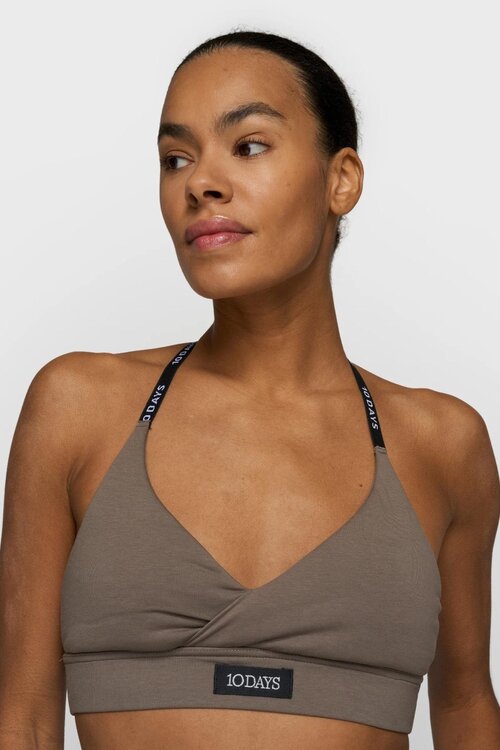 De 10DAYS The Bar Bra in de kleur moonrock biedt een stijlvolle en comfortabele basis voor elke outfit. Deze bh heeft een slim fit en is vervaardigd uit zachte katoenen jersey, met een dubbellaagse constructie voor extra ondersteuning. De gewatteerde cups en subtiele 10DAYS logo-accenten geven een sportieve en herkenbare look.