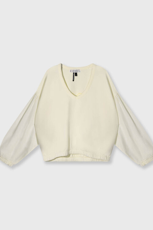 Deze sweater heeft een ontspannen pasvorm en opvallende pofmouwen. Het lichaam is gemaakt van zacht, GOTS-gecertificeerd biologisch katoenen fleece, terwijl de mouwen van geweven piquĆ© katoen zijn. De trui heeft een ribgebreide V-hals en zoom, en geplooide mouwen met elastische uiteinden. Op de rug prijkt een varsity ā€˜10DAYS’ logo. Uitgevoerd in de kleur faded pastel yellow, biedt deze sweater van 10DAYS Amsterdam een comfortabele, relaxte fit. Het materiaal bestaat uit 88% biologisch katoen en 12% gerecycled polyester.