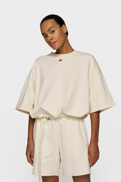 De 10DAYS ballontrui in zachte vanille biedt een ontspannen pasvorm met een eigentijdse en vrouwelijke look. Het zachte biologische katoen, gecertificeerd door GOTS, voelt heerlijk aan, terwijl de ballonvormige zoom en subtiele 10-monogram borduursel de kenmerkende 10DAYS stijl benadrukken.