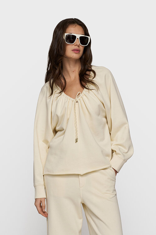 De 10DAYS LA Sweater Gathering in zachte vanille biedt een ontspannen pasvorm met een sportieve en elegante uitstraling. Vervaardigd van zachte katoenen LA fleece voor ultiem comfort en een eigentijdse look.