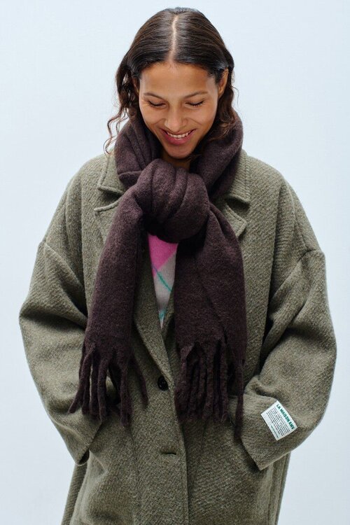 De Zinaco sjaal van American Vintage in de warme brownie tint is een zachte, tijdloze must-have die elke outfit verrijkt.