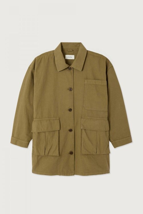 De Namaz damesjas van American Vintage, uitgevoerd in de kleur liaan, biedt een halflange lengte met een robuuste, stedelijke uitstraling. De jas is vervaardigd uit een gestructureerde twill van katoen en linnen, wat zorgt voor een droog en compact gevoel. De oversized pasvorm en ruime zakken geven een eigentijdse en relaxte look.