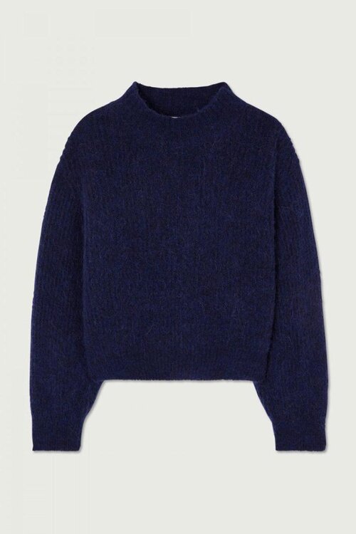 American Vintage East sweater in navy met vlekken: een kort en oversized ontwerp met een opstaande kraag, gemaakt van zachte Italiaanse garens. Stijlvol, warm en eenvoudig te stylen. Lees meer.