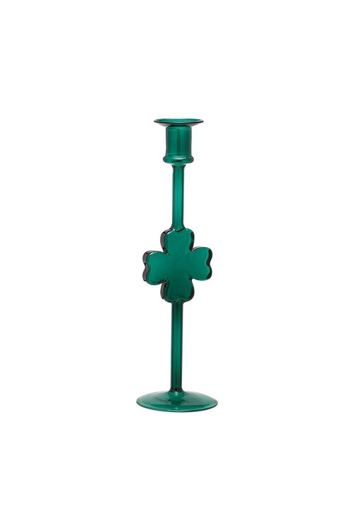 Anna + Nina Shamrock Kandelaar in een rijke diepgroene tint van borosilicaatglas, voorzien van een elegant klavermotief. Met een afmeting van 29 x 7,5 x 8 cm is deze houder ideaal voor dinerkaarsen en voegt hij een verfijnde touch toe aan elke tafelsettin Lees meer.