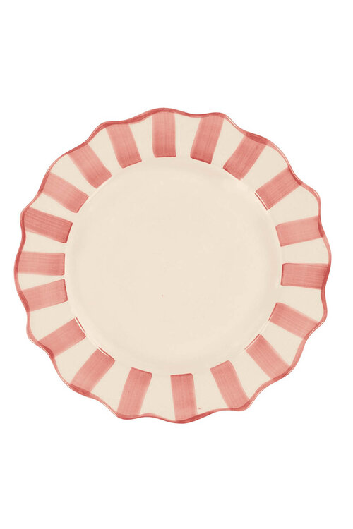 Het Anna + Nina Pink Scalloped Ontbijtbord is vervaardigd uit handgemaakt keramiek en heeft charmante roze strepen. Dit bord is vaatwasserbestendig en brengt een speelse touch aan je eettafel.