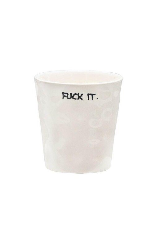 - Met de hand gemaakte beker met de tekst “Fuck It” in zwart