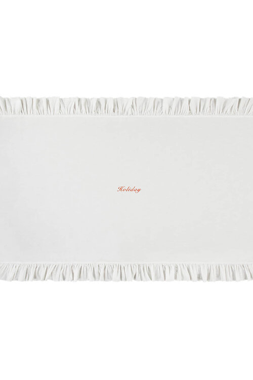 Breng de zomer naar je tafel met de Holiday Ruffle Tablecloth van Anna+Nina. Met het āHolidayā borduurwerk centraal en een speelse ruffle rand is het ideaal voor lange diners en gezellige borrels.