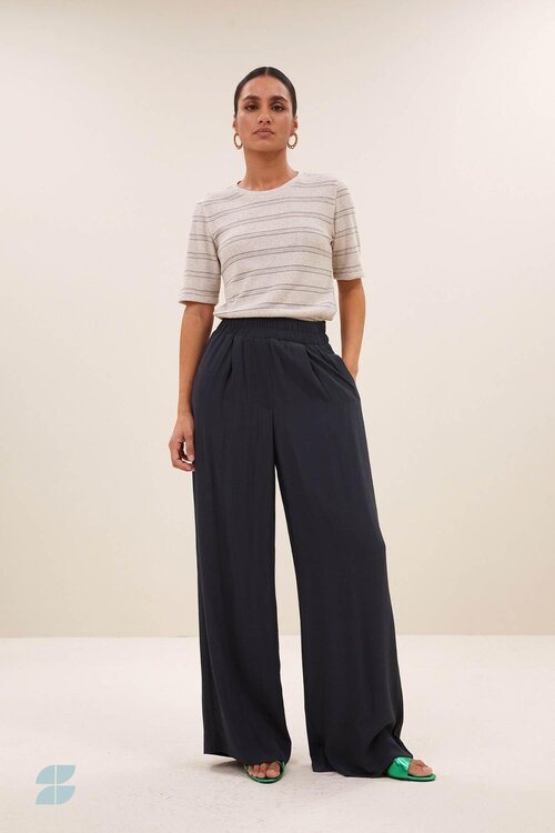 De benji viscose broek van by-bar is een stijlvolle en soepelvallende broek in de kleur graphite, vervaardigd uit 100% Ecovero viscose. Dankzij de elastische tailleband en wijde pijpen biedt deze broek zowel ultiem comfort als een elegante look.