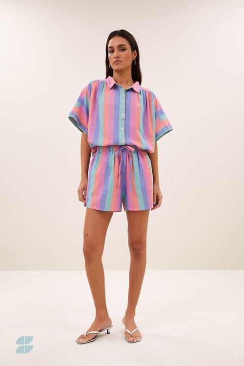 De speelse en vrouwelijke uitstraling komt door de combinatie van de regenboogstreepprint en subtiele plooien.