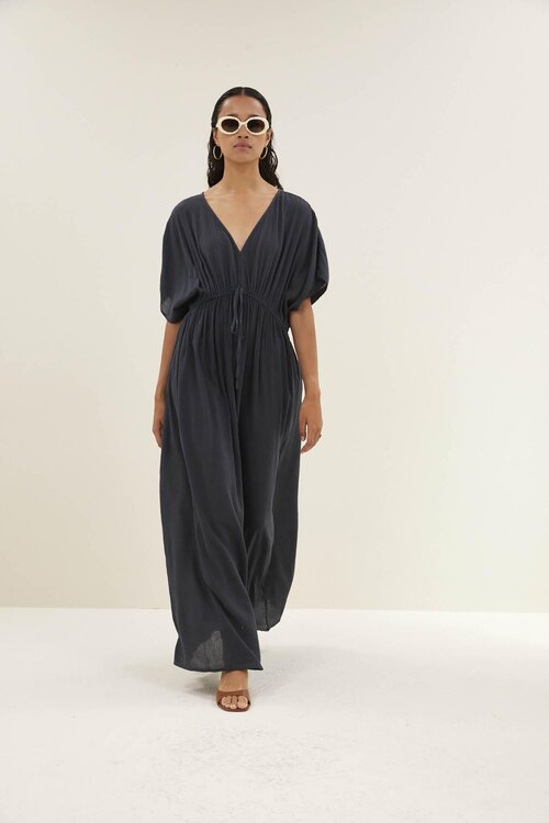 De lange jurk van by-bar is een luchtige maxi-jurk met een diepe V-hals en een strikkoord in de taille. De kleur charcoal geeft de jurk een elegante en tijdloze uitstraling, terwijl de vloeiende stof prachtig met je meebeweegt – ideaal voor zomerse dagen en warme avonden.