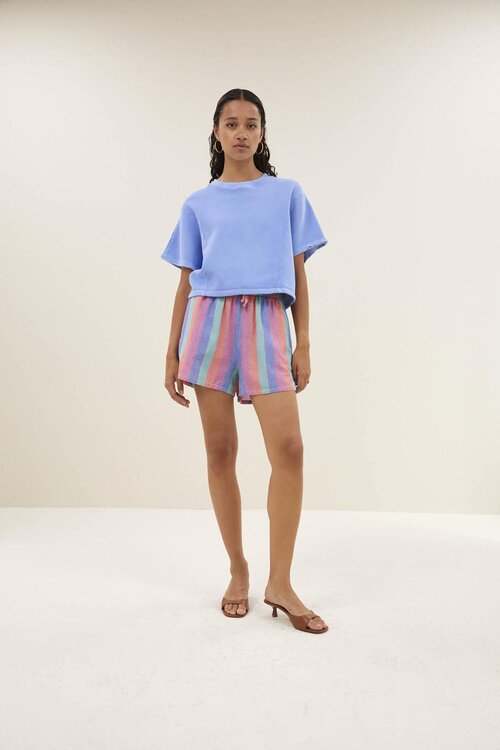 De suki sweat top van by-bar is een comfortabele, boxy sweat top met korte mouwen in de kleur city blue. Dankzij de relaxte pasvorm, iets kortere lengte en sportieve look is dit de ideale zomerse sweater voor een casual maar verzorgde outfit.