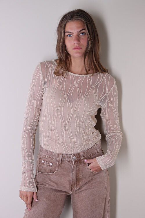 De semi-transparante meshstof en het verticale, golvende stikselpatroon geven deze top een verfijnde en moderne uitstraling.