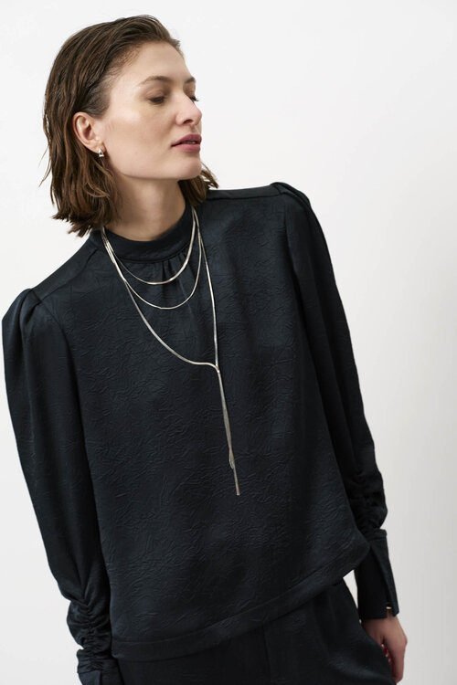 De unieke details maken deze top bijzonder: pofschouders met plooien, lange mouwen met een subtiel gerimpelde afwerking en een elegante split bij de manchetten. De satijnen look met een licht gekreukt effect geeft de Pristine top een moderne en luxueuze uitstraling. Combineer hem met de bijpassende Summit broek voor een chique ensemble, of draag hem met jeans voor een moeiteloze, kantoorwaardige look.