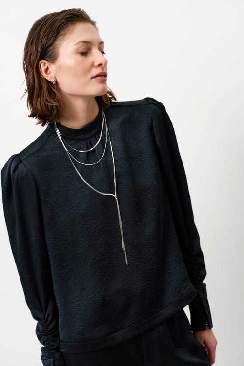 De verfijnde details maken deze top uniek: pofschouders met plooidetail, lange mouwen met subtiel gerimpelde afwerking en een elegante split bij de manchetten. Dankzij de satijnen look met licht gekreukt effect krijgt de Pristine top een moderne en luxueuze uitstraling. Perfect te combineren met de bijpassende Summit broek voor een chic ensemble, of met jeans voor een moeiteloos office-proof look.
