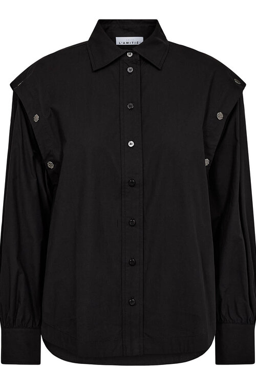 Haute L’Amitié zwarte blouse met opvallende schouderdetails en een elegante knoopsluiting. Lees meer.
