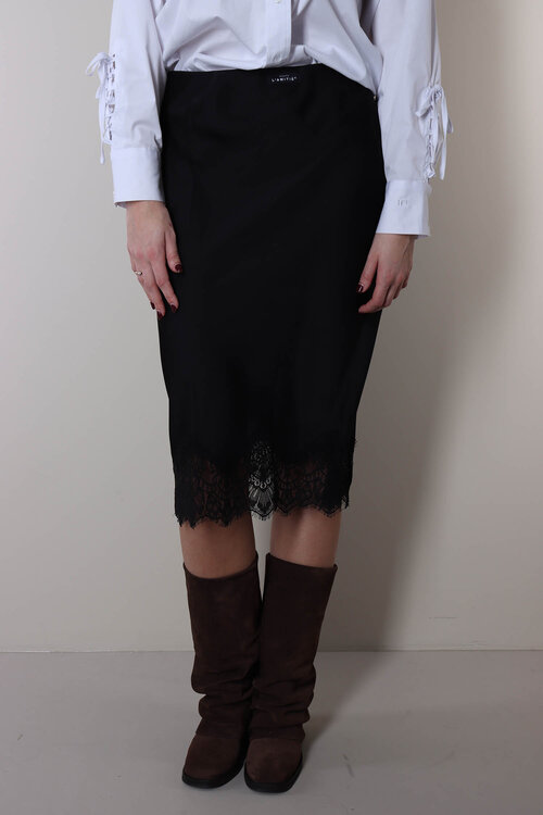 HAUTE L'AMITIE Naomi rok in glanzend zwart met elegante kanten details. Deze rok heeft een mid-waist design, valt soepel en is voorzien van een comfortabele elastische tailleband. Lees meer.
