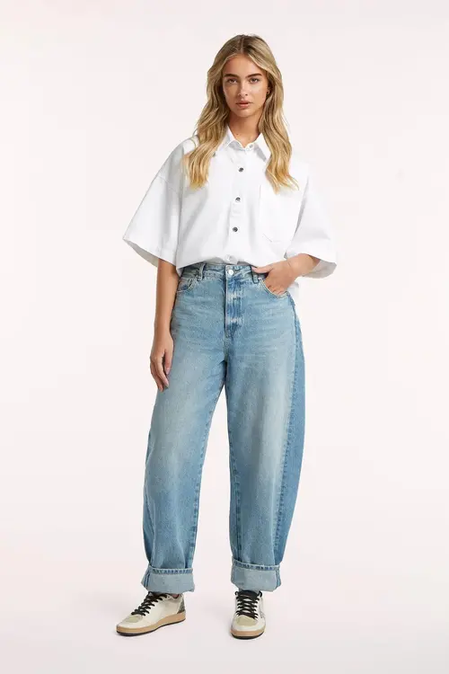 De jeans heeft een mid rise taille en een barrel fit, wat betekent dat hij ruimer is rond de heupen en iets taps toeloopt naar de enkels.