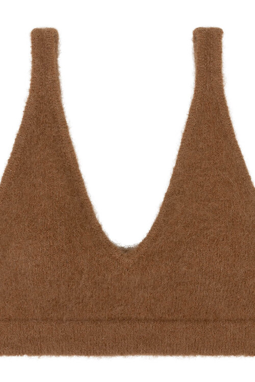 De bruine Josey bralette van Love Stories biedt een zachte en comfortabele ervaring met een diepe V-hals. Deze top is vervaardigd uit een luxe mix van alpaca-wol, wat zorgt voor een gezellige en vrouwelijke uitstraling, ideaal voor loungen of als laagje.