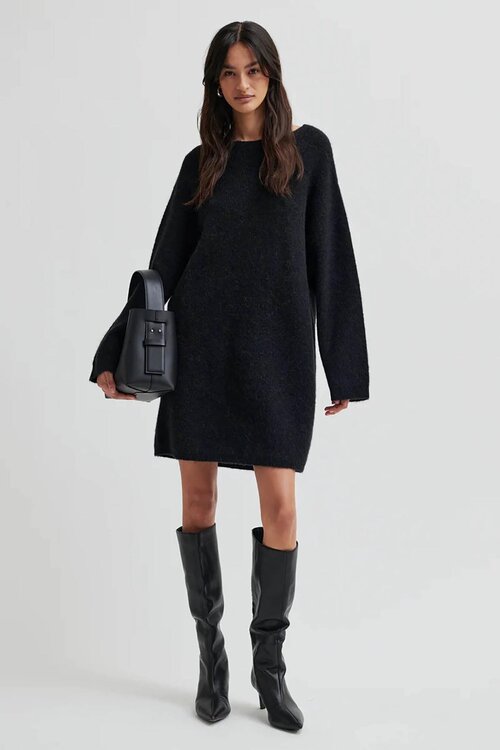 De Gabby Knit Dress van Second Female is een comfortabele, harige jurk gemaakt van een alpaca-wolmix, met een V-hals die zowel aan de voor- als achterkant gedragen kan worden. De jurk heeft verlaagde schouders en een ontspannen rechte pasvorm.