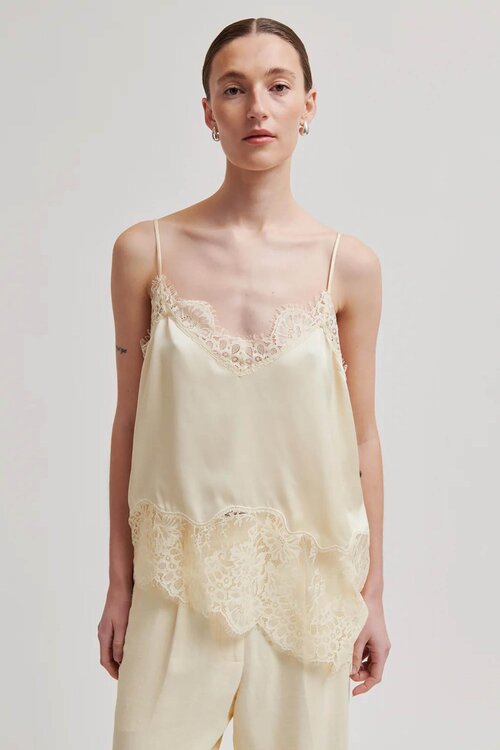 Second Female Wilina Strap Top in alabaster gleam. Deze luchtige top, gemaakt van 100% viscose, biedt een elegante en vloeiende pasvorm. Nu verkrijgbaar bij VAND. Lifestyle. Lees meer.