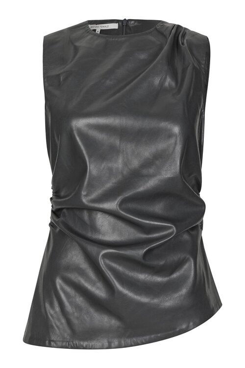 Second Female Faux Leather Top – Zwarte top van imitatieleer met plooidetails