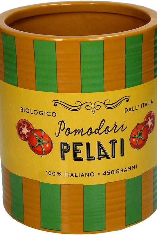 De vaas is geïnspireerd door klassieke Italiaanse verpakkingen van gepelde tomaten – een eerbetoon aan la dolce vita.