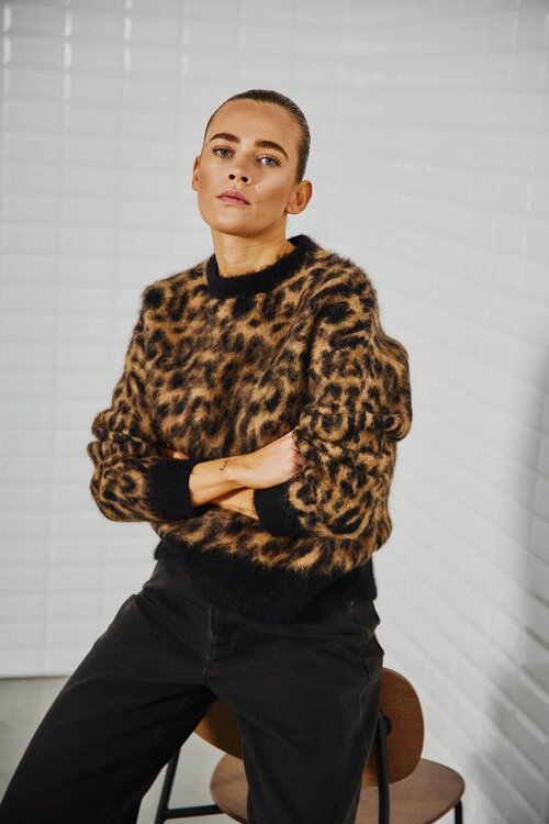 De Alondra Pullover van With Black in Camel Black is een opvallende knit die warmte en stijl moeiteloos combineert. De zachte wolmix met een luxueuze fluffy finish voelt heerlijk comfortabel aan, terwijl de krachtige leopardprint zorgt voor een uitgesproken en eigentijdse uitstraling. De klassieke ronde hals en contrasterende zwarte boorden maken dit ontwerp helemaal af.