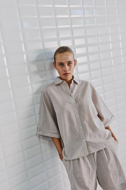 De blouse heeft een losse, korte pasvorm met wijde mouwen voor een relaxte en moderne look.