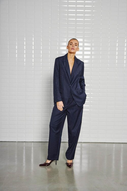 De Valentina broek van With Black in de kleur Midnight Blue biedt een frisse kijk op klassieke tailoring. Deze broek heeft een subtiele krijtstreep en een relaxte pasvorm, wat zorgt voor een eigentijdse en verfijnde uitstraling. De hoge taille en plooien aan de voorkant creëren een flatterend silhouet, terwijl de rechte pijpen een tijdloze stijl behouden.