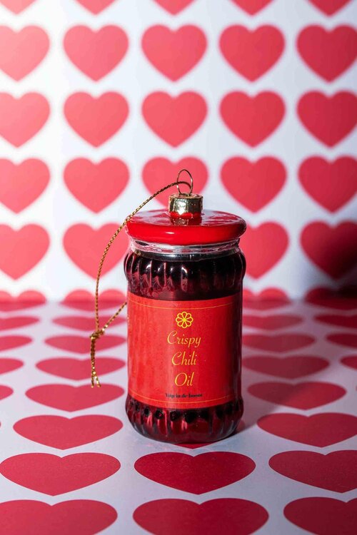 - Glazen kerstornament in de vorm van een pot crispy chili oil